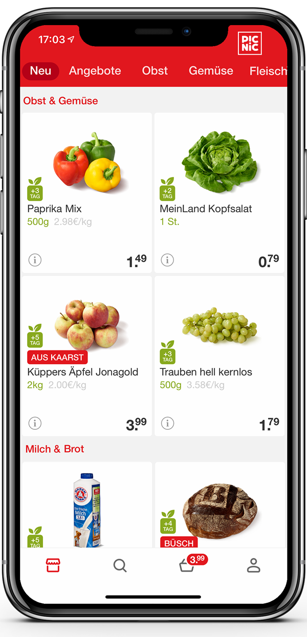 Was mich an der Bedienung in der App anfangs etwas gestört hat, ist, dass wenn man auf das Produktbild klickt, der Artikel sofort im Einkaufswagen landet. Produktinformationen erhält man vorab, indem man auf ein sehr kleines Info-Icon links unten am Produktbild klickt. Das ist etwas unergonomisch, man gewöhnt sich aber schnell daran. Wenn man die gleichen Produkte öfters kauft, ist es natürlich durch das schnelle Antippen der Bilder auch besonders schnell möglich, seinen Einkauf zu erledigen. Da Picnic auf Stammkunden setzt, ist diese Fokussierung nachvollziehbar. Mittlerweile komme ich auch gut zurecht damit.
