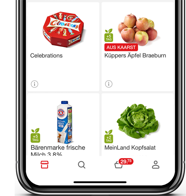 Bestellt wird über eine App (für Android und iOS). Die ist sehr übersichtlich und logisch nach Kategorien strukturiert. Eine Suchfunktion zum Eingeben von Produktnamen gibt es auch. Durch Antippen der Produktbilder legt man den gewünschten Artikel in den Warenkorb. Dort kann man auch die Anzahl noch nachträglich ändern und die Produkte ggf. wieder löschen.